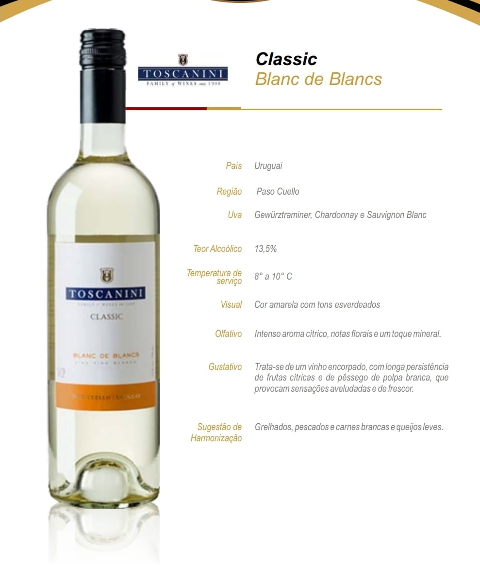 Apresentamos o Vinho Toscanini Classic Blanc De Blancs Uruguaio, uma seleção que destaca a pureza e a tradição das vinícolas do Uruguai. Com uma graduação alcoólica de 12.5, este vinho branco é perfeito para diversas ocasiões, aliado à sua versatilidade.