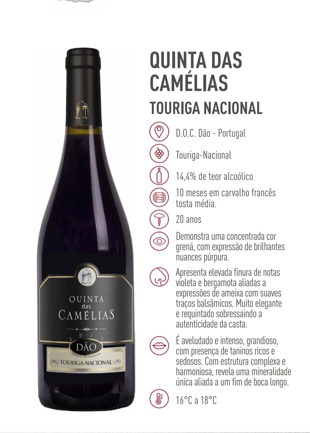 O Vinho Português Quinta das Camélias Touriga Nacional DOC 750ml é um rótulo sofisticado da tradicional região do Dão, elaborado exclusivamente com a uva Touriga Nacional. Apresenta coloração grená intensa com reflexos púrpura, revelando grande concentração e elegância.