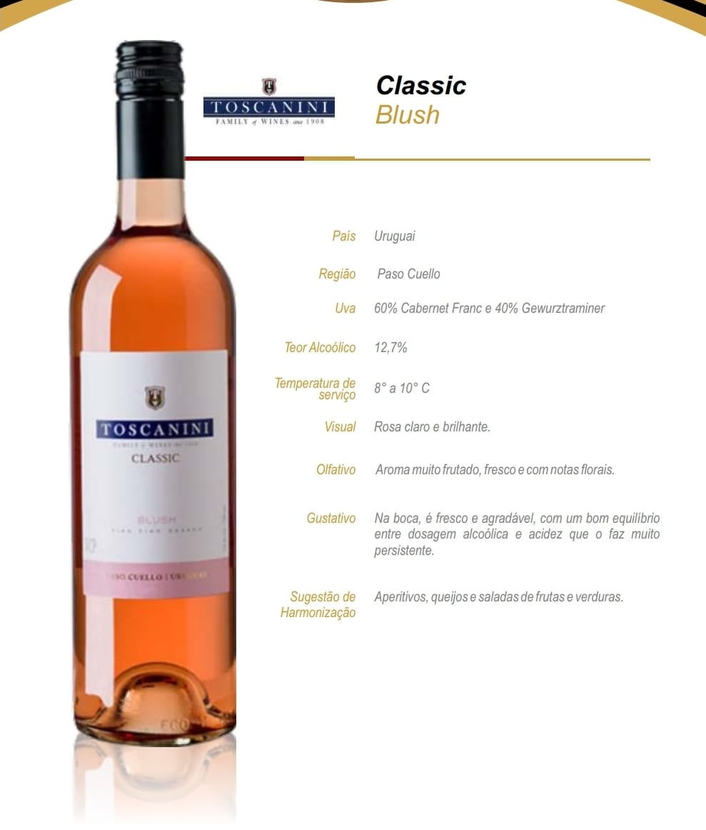 O Vinho Uruguaio Toscanini Classic Rosé Blush Seco 750ml é um rótulo leve, fresco e elegante, produzido na região de Paso Cuello, no Uruguai. Elaborado com as uvas Cabernet Franc e Gewurztraminer, apresenta coloração rosa claro brilhante, aromas intensamente frutados com delicadas notas florais e, em boca, destaca-se pelo frescor, equilíbrio e boa persistência. Ideal para ser apreciado entre 8° e 10°C, harmoniza perfeitamente com aperitivos, queijos e saladas, sendo uma excelente escolha para momentos leves e descontraídos.